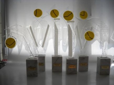 Tennispokale, wahlweise mit Marmor- oder Sandsteinsockel. Anstelle des Tennisballs sind auch andere Symbole denkbar.